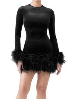 Women Autumn Dress Feather Trim Long Sleeve Bodycon Mini Dress Elegant Club Party Retro Sexy Korean Fashion Dresses