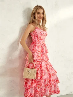 Women Floral Layered Ruffle Dress Spaghetti Strap A-line Long Dress Summer Bohemian Beach Retro Dresses Y2K Aesthetic Clothes