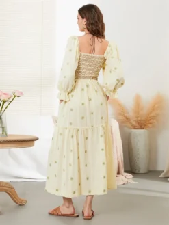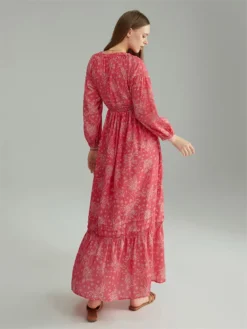 Women Floral Flowy Long Dress Puff Half Sleeve V Neck Loose Ruffle A-line Dress Bohemian Casual Vintage Chic Dresses Summer Fall