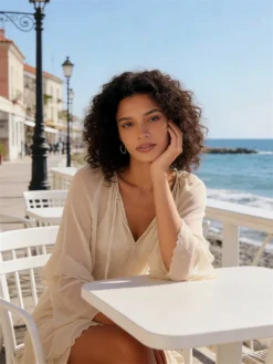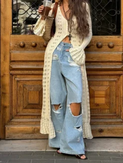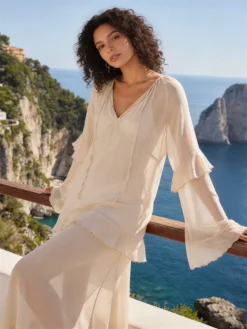 Women’s Loose Fit Chiffon Long Dress Stylish Ruffle Trim V Neck Long Sleeve Long Dress See Through Cover-ups Streetwear