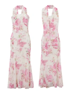 Women’s Halter Long Dress Bow Decorated Open Back Sleeveless V Neck Bodycon Elegant Dress for Party Evening Date