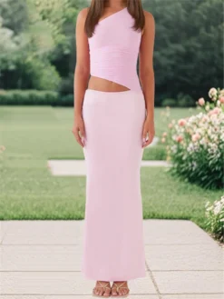 Women’s One Shoulder Long Dress Stylish Solid Hollow Out Sleeveless Slim Fit Bodycon Summer Dress for Party Evening