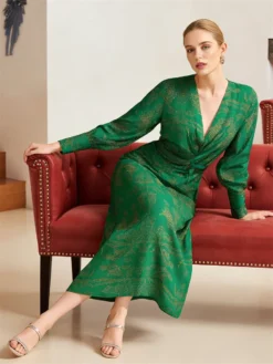 Women Retro Printed Long Dress Deep V Neck Long Sleeve Cinched Waist Mid Dress Spring Fall Casual Elegant Dresses