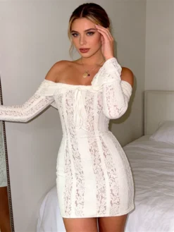 Women Lace Flower Mini Dress Flare Long Sleeve Off Shoulder Bodycon Short Dress for Holiday Daily Club Sexy Dresses