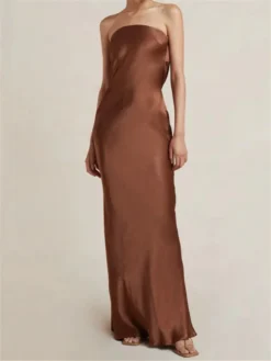 Women’s Elegant Long Satin Tube Dress Solid Color Low Cut Strapless Pleated Design Slim Dress for Party Evening
