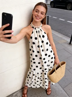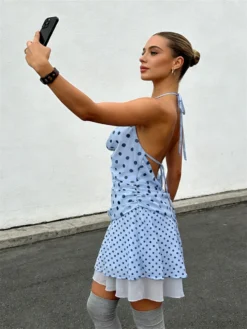 Women Dots Print Mini Dress Backless Halter Sleeveless Loose Mesh Flowy Dress Summer Bohemian Party Beach Casual Streetwear