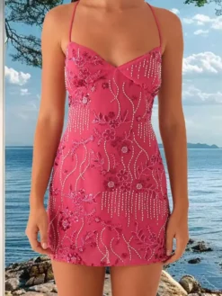 Women Mini Halter Neck Dress Sequin Bead Floral Sleeveless Backless Bodycon Dress for Daily Party Club