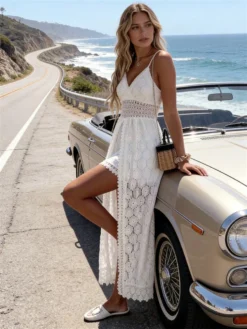 Women Slip Dress Sleeveless Backless Slit Dress Lace Patchwork Summer Long Dress for Cocktail Party