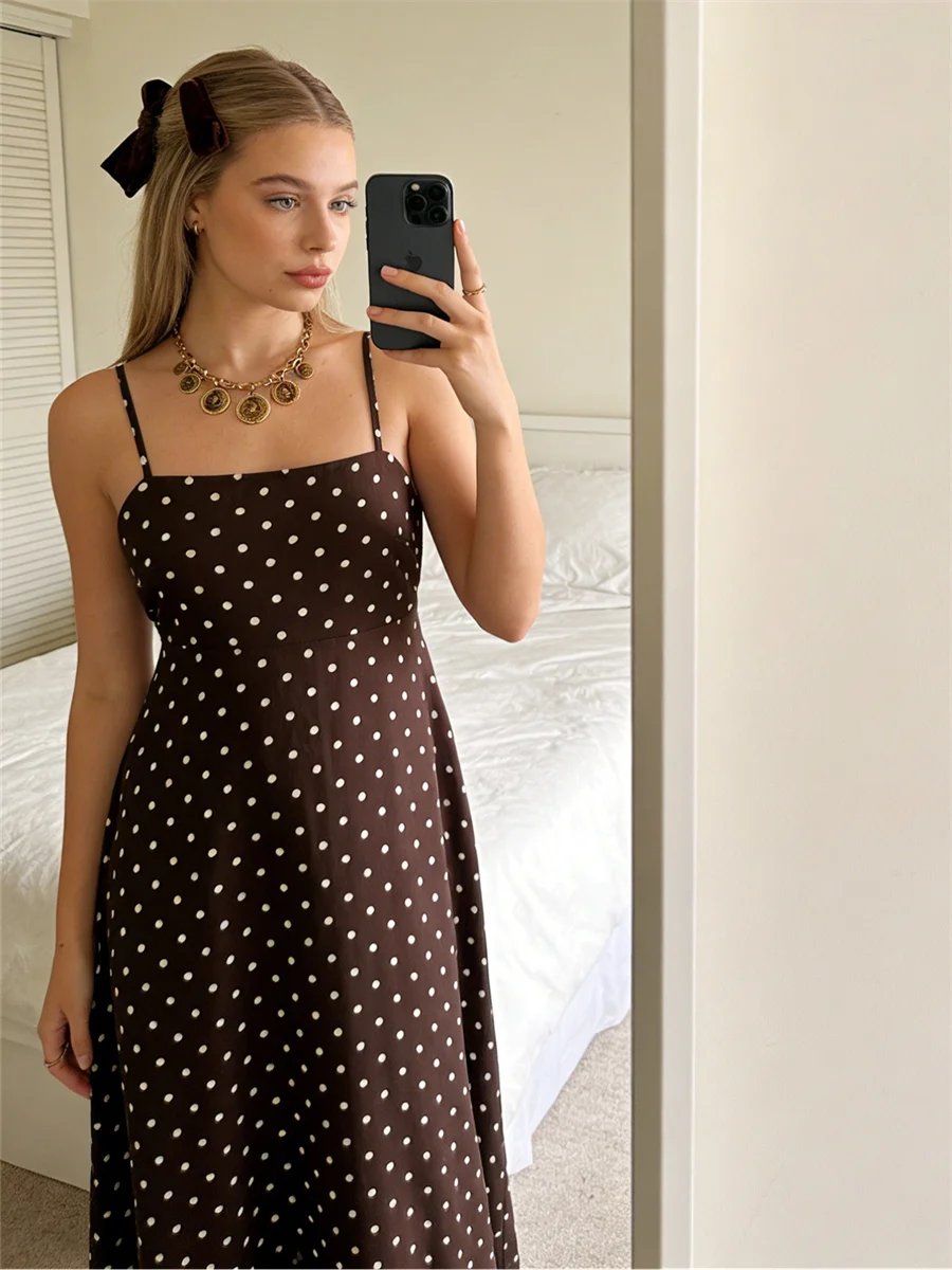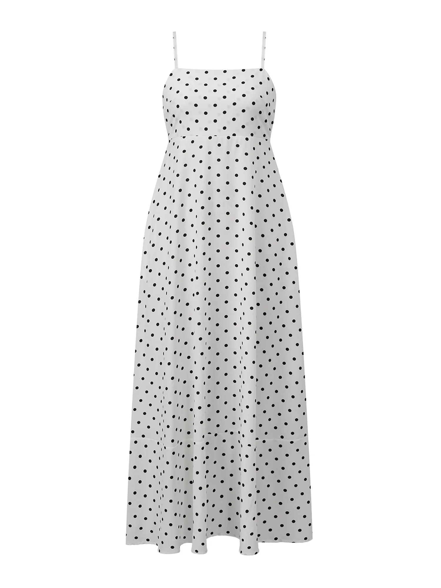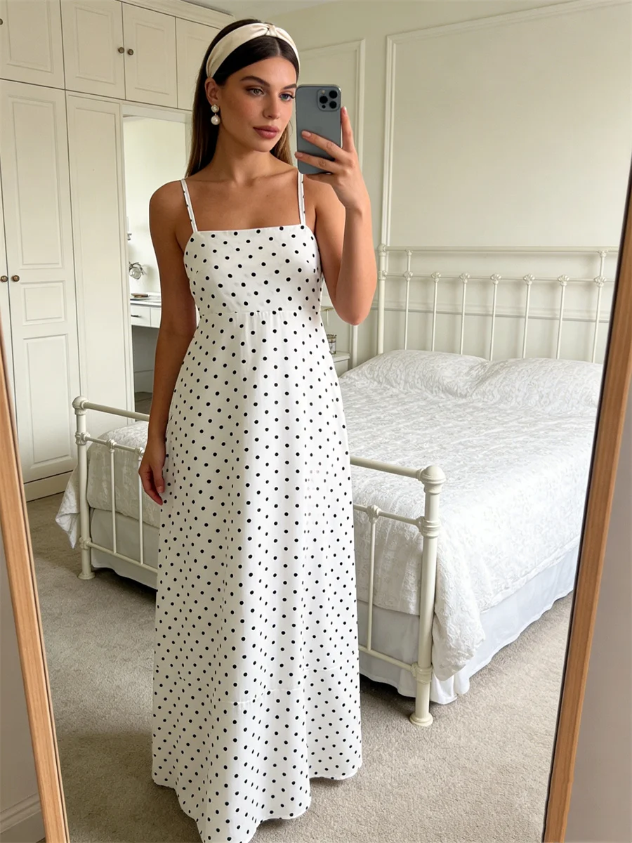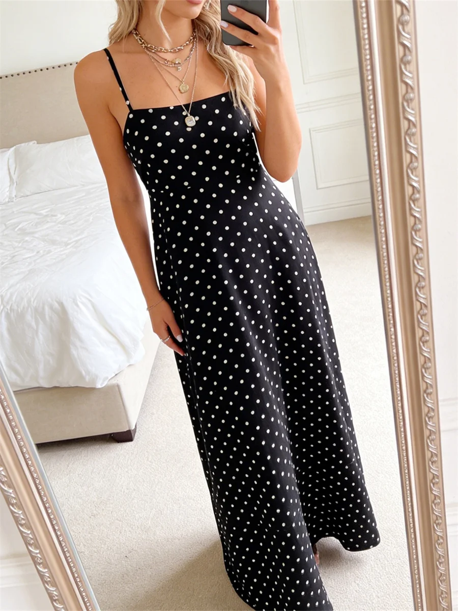 Women’s Summer Slip Dress Dot Print Sleeveless Spaghetti Strap Backless Long A Line Dress with Pockets