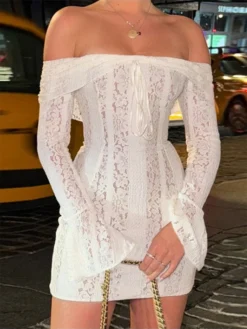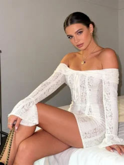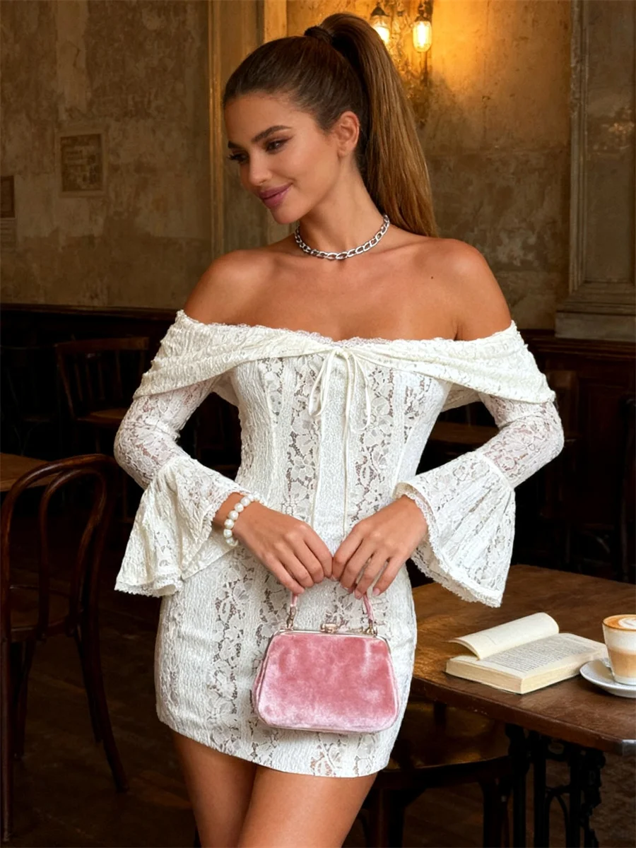 Women Off Shoulder Lace Dress Floral Pattern Bow Ruched Boat Neck Long Sleeve Slim Fit Short Dresses