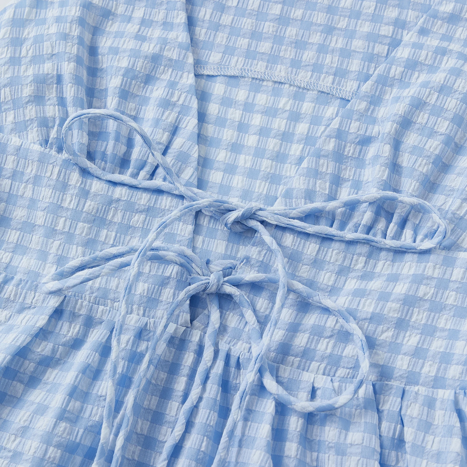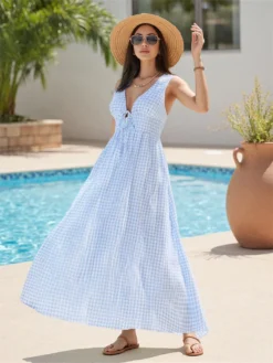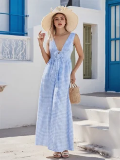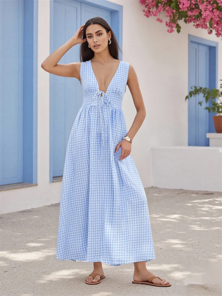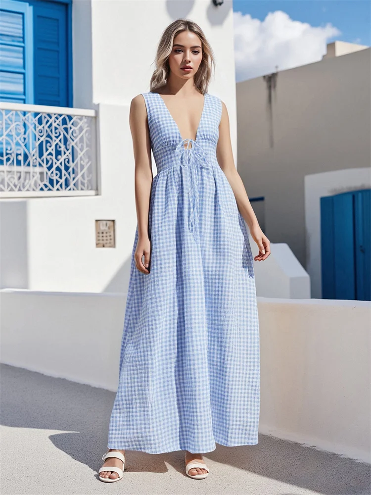 Women Sleeveless Tank Dress Casual Summer Stripe/Plaid Print Tie up Deep V-Neck Party Dress for Beach Club Streetwear