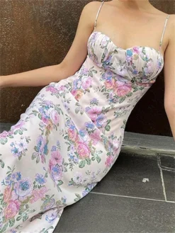 Women Sling Dress Spaghetti Straps Low-cut Flower Print Midi Dress 2024 Summer Party Vacation Casual Retro