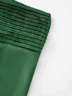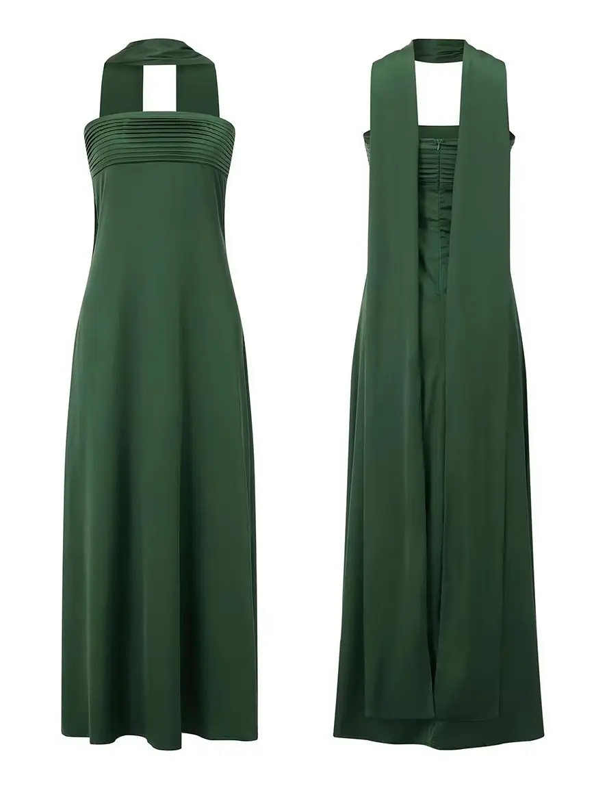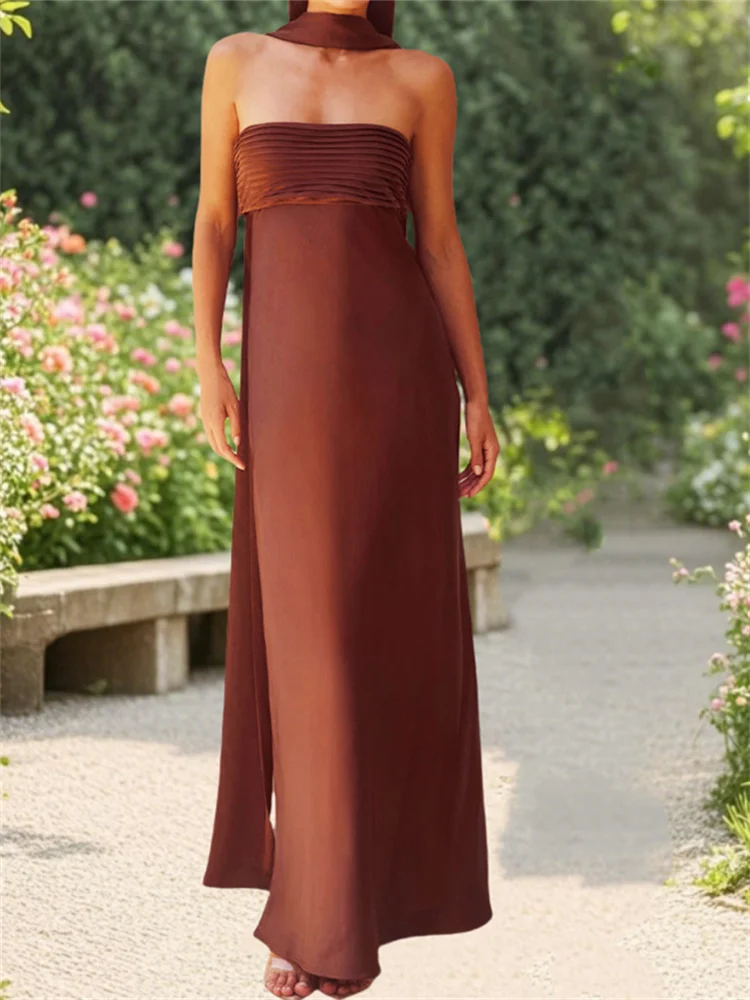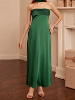 Women's Long Satin Tube Dress Solid Color Low Cut Strapless Pleated Design Slim Dress