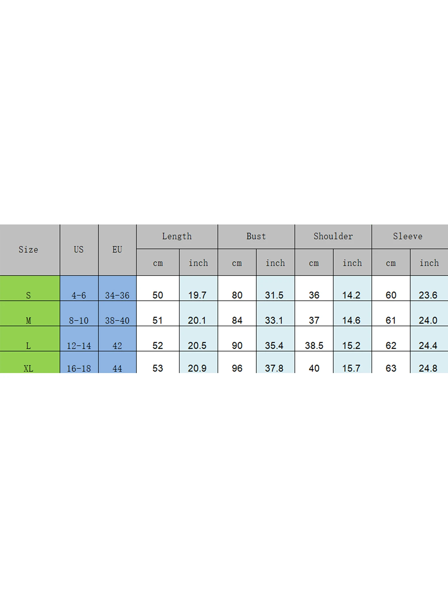 S Length: 19.68 Bust: 31.5 Sleeve: 23.62 Shoulder: 14.17