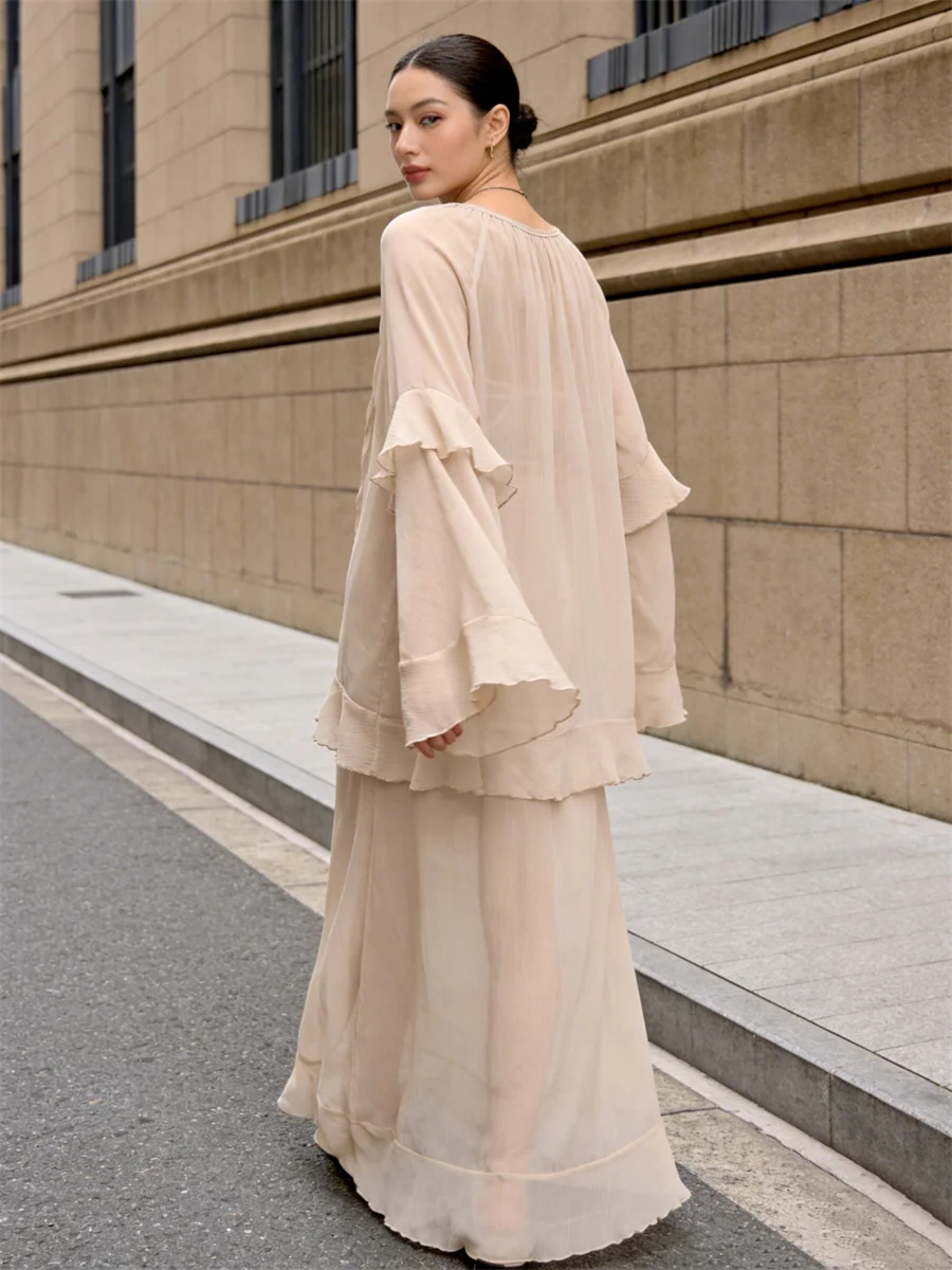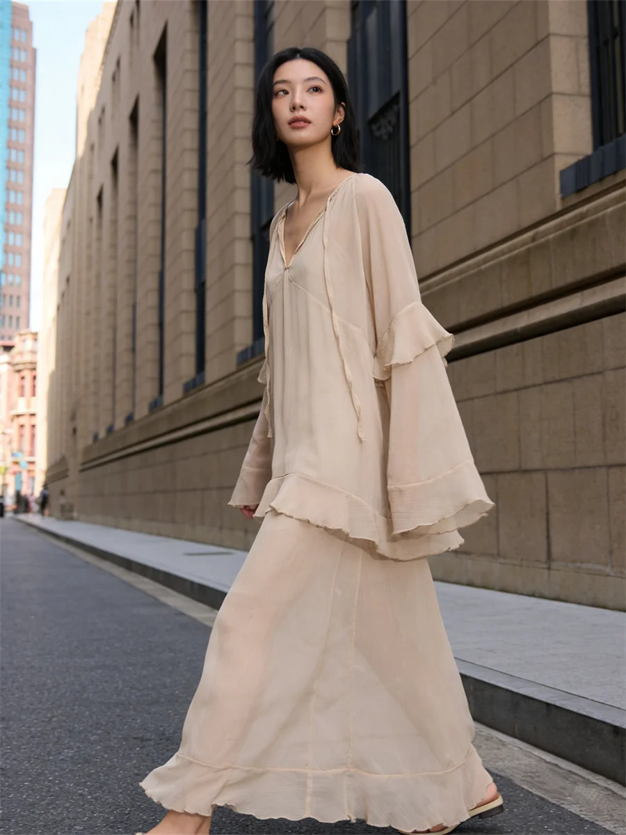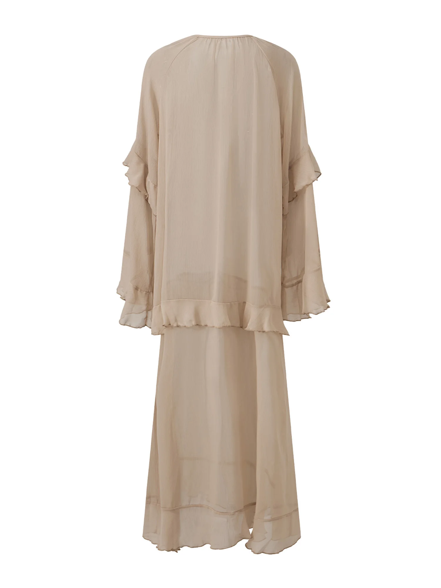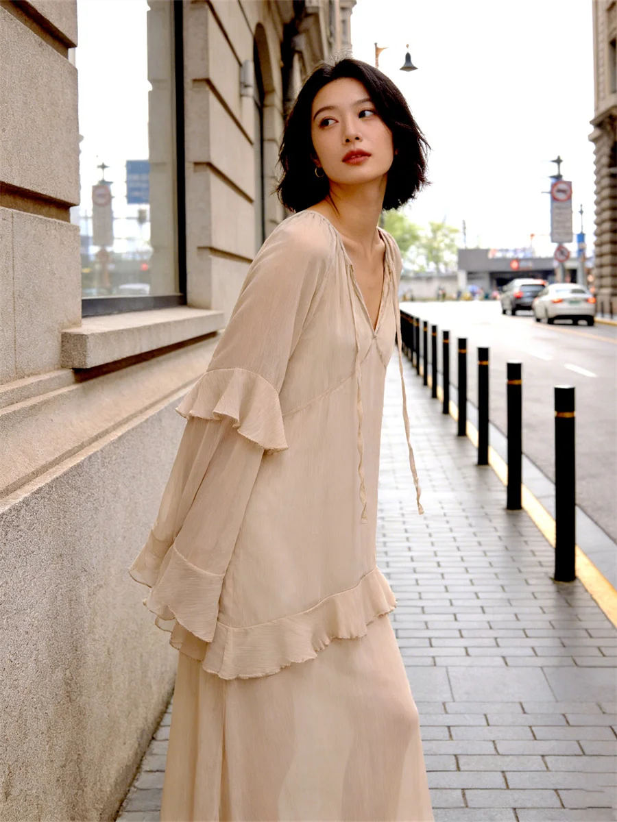 Women’s Spring/Summer Long Dress Loose Fit Stylish Ruffled Trim Solid V Neck Long Sleeve Sheer Dress