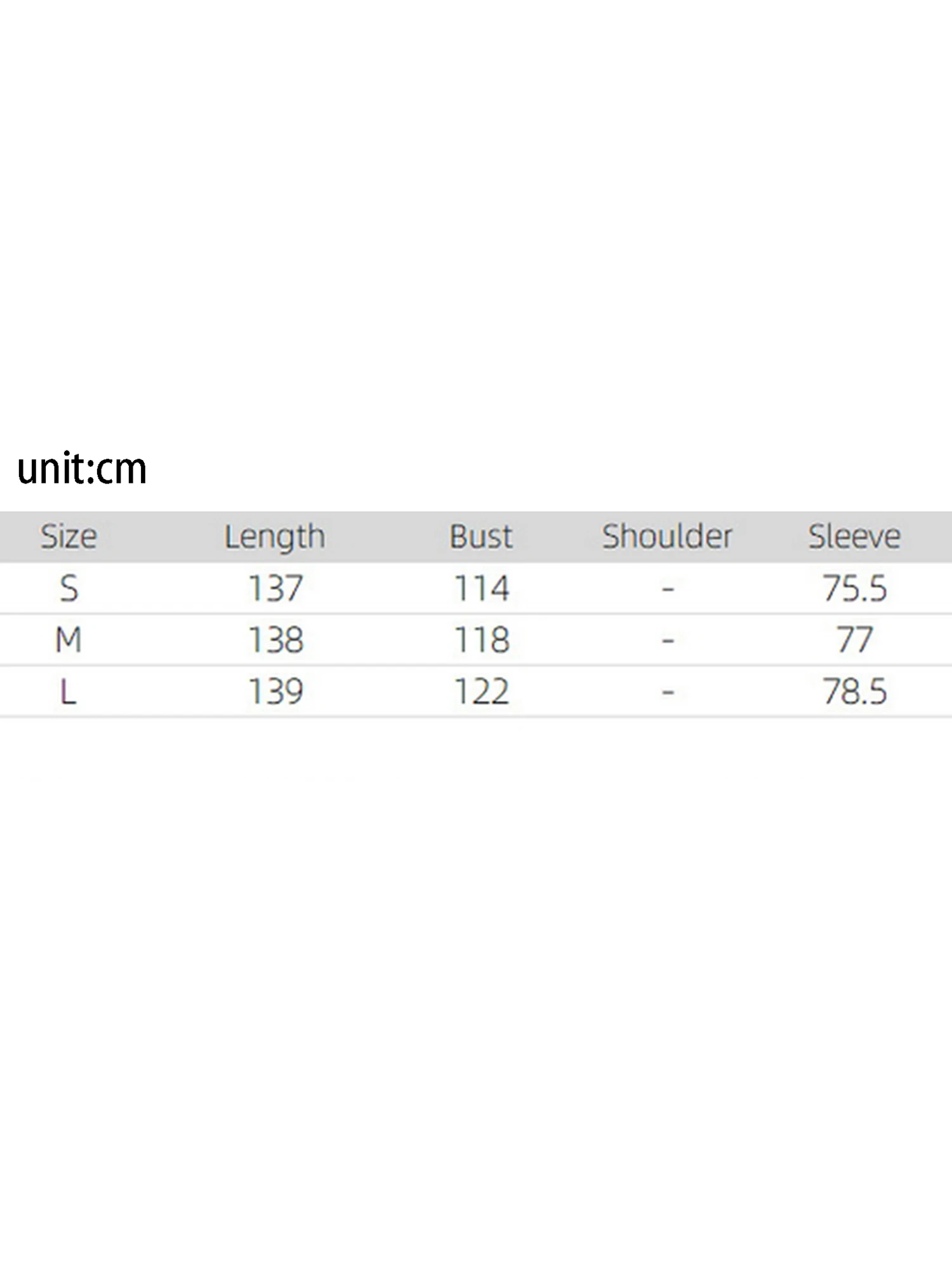 S Length: 137 Bust: 114 Sleeve: 75.5