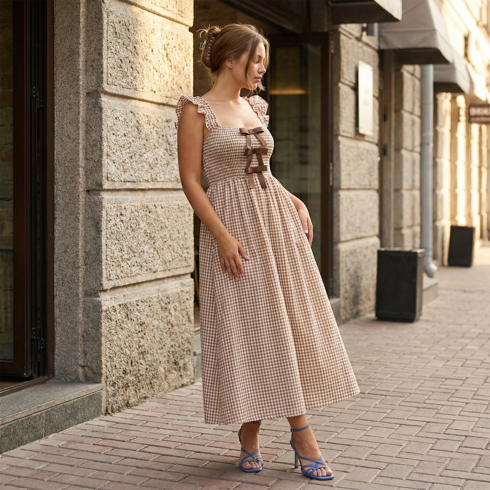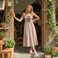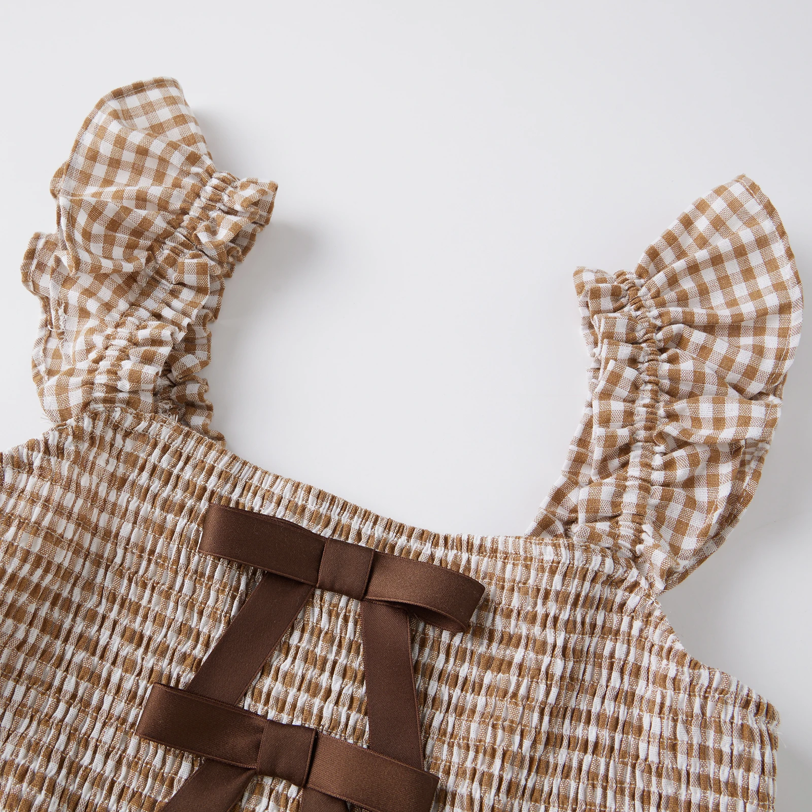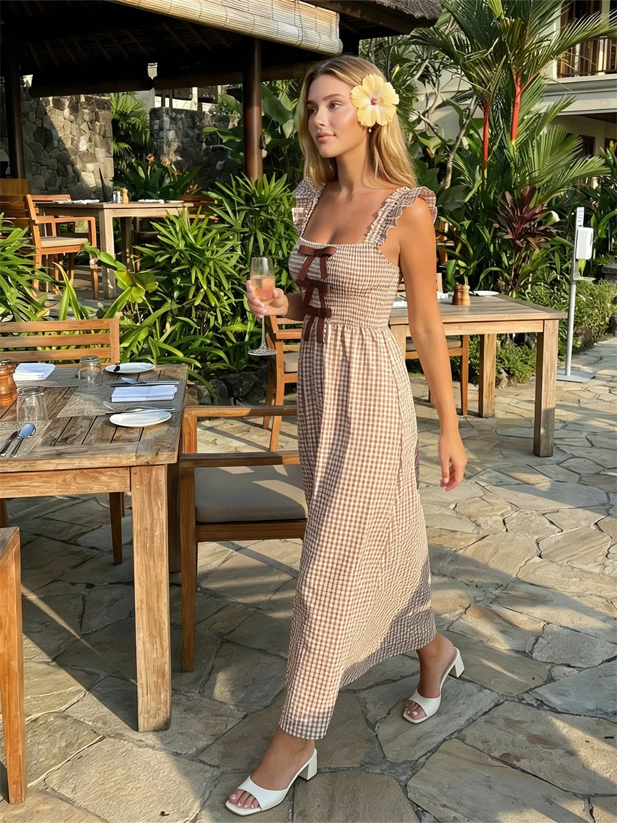 Women’s Plaid Dress Stylish Decorative Bow Smocked Ruffled Trim Flying Sleeve Long A-Line Dress
