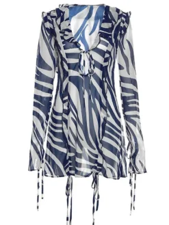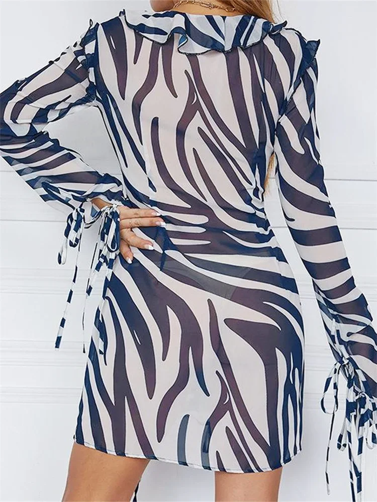 Womens Summer Short Tie Up Dress Long Sleeve V Neck Zebra Print Hollow Dress