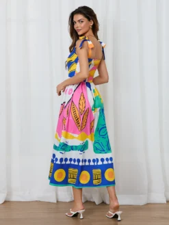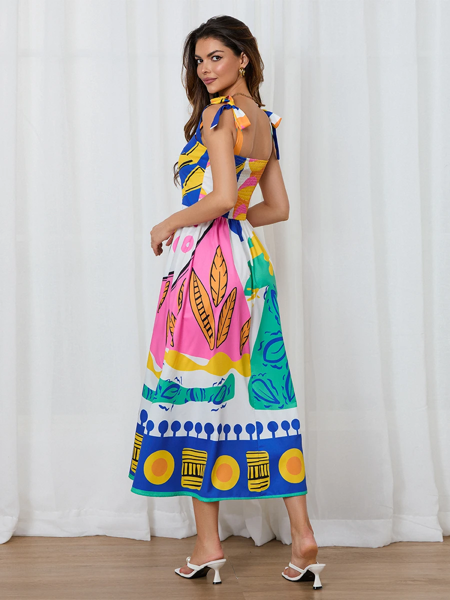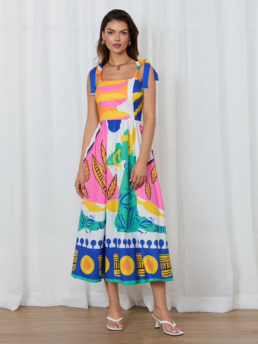 Women's Summer Bohemia Dress Sleeveless Tie Shoulder Strap Square Neck Long Flowy Dress for Beach