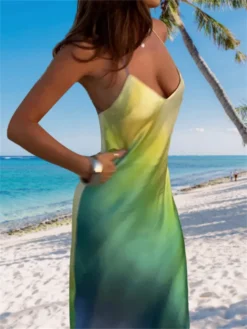 Women’s Summer Cami Long Dress Gradient Color Spaghetti Strap V-Neck Backless Beach Evening Party Dress