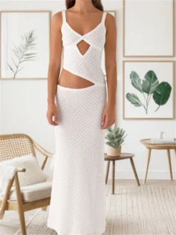 Women’s Sleeveless White Long Dress Spaghetti Strap Hollow Out Bodycon Summer Dresses for Party Club Beach Elegant