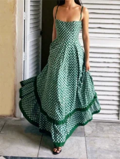 Women’s Long Cami Dress Spaghetti Strap Checkerboard Print Loose Flowy Dress Summer Bohemian Holiday Party Elegant Dresses