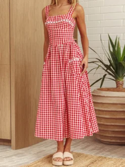 Women’s Plaid Long Cami Dress Summer Sleeveless Open Back A-line Dress with 2 Pockets Beach Holiday Sundress